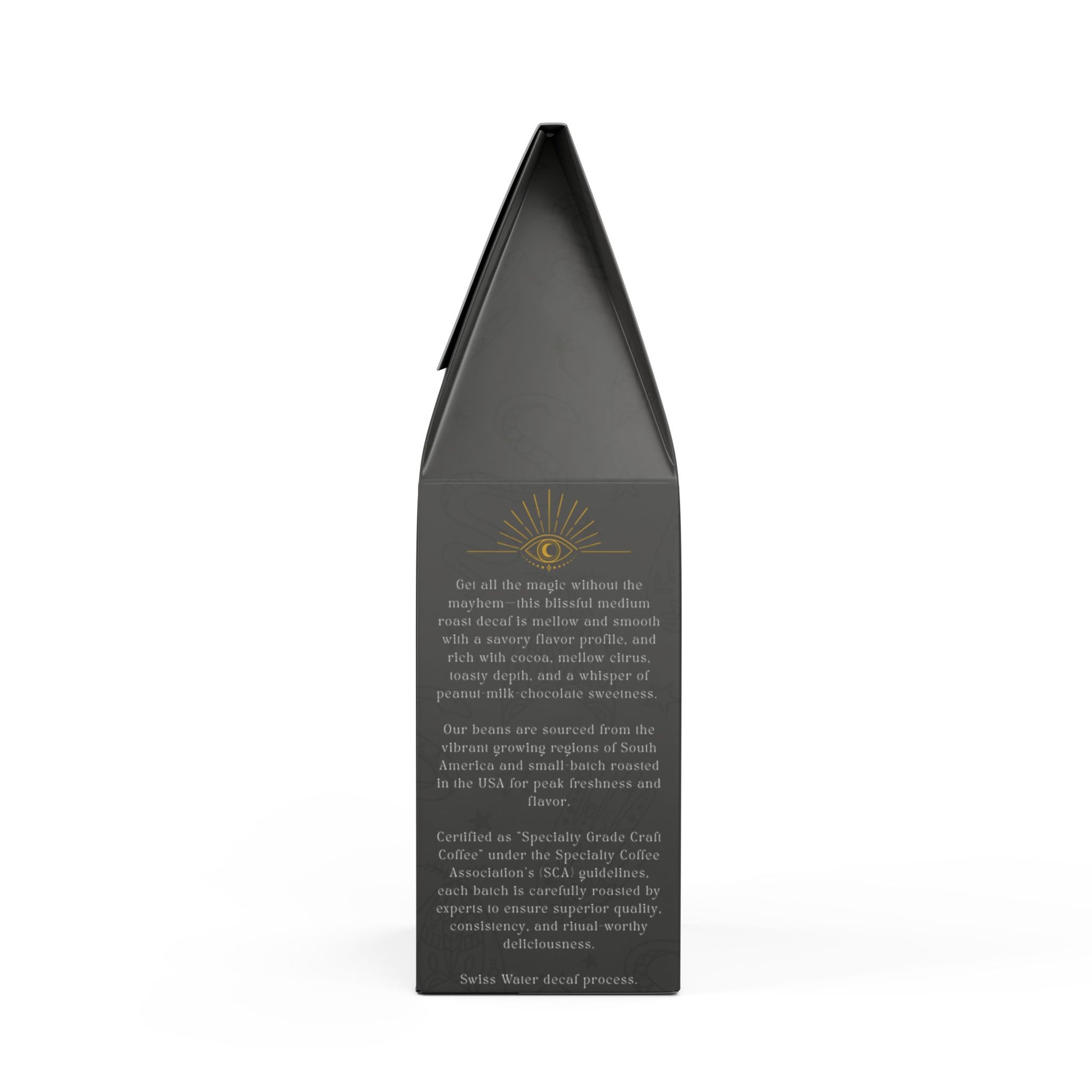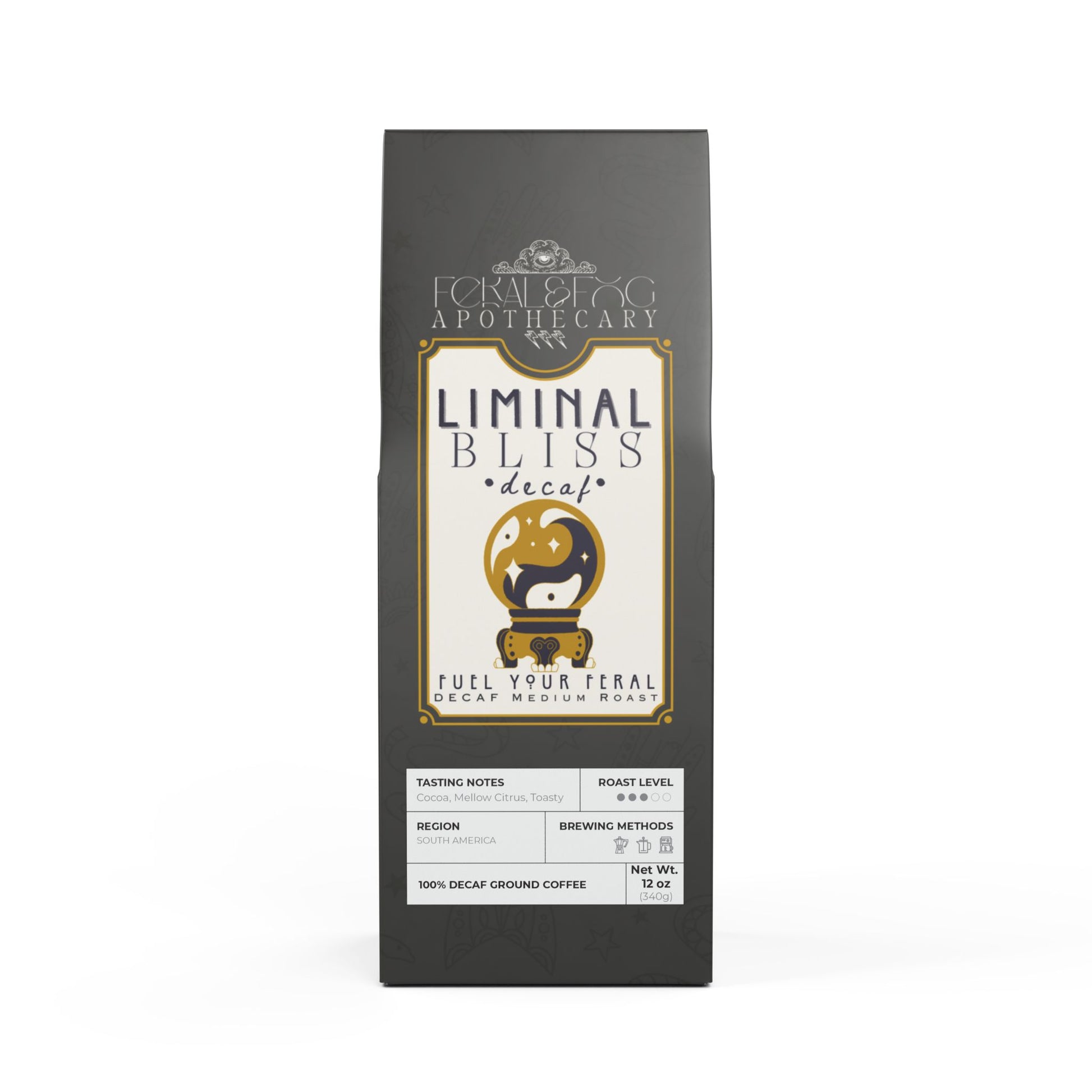 This mellow, savory cup brings subtle notes of peanut and milk chocolate with a whisper of mellow citrus, crafted from South American beans and decaffeinated through the clean Swiss Water process. LIMINAL BLISS is made for late-night witches, dawn-tired dreamers, and anyone craving the magic of coffee without the buzz.
